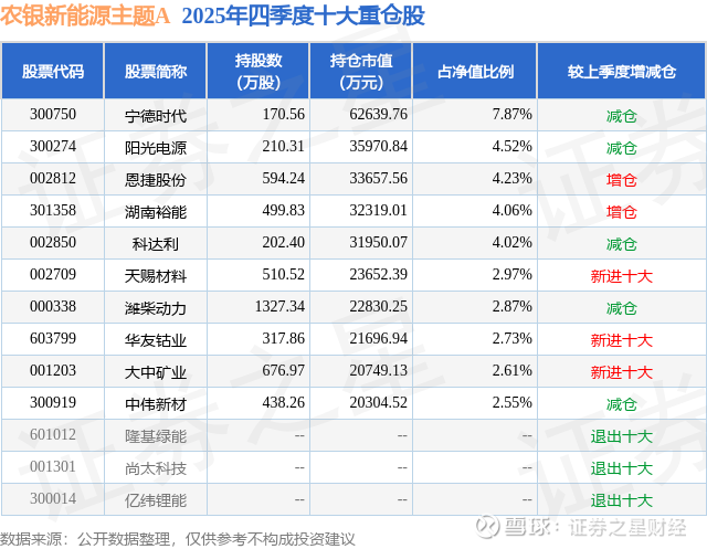 根据2025基金年报公募基金重仓股数据,重仓该股的公募基金共10家,其中持有数量最多的公募基金为农银汇理基金的农银新能源主题A。农银新能源主题A目前规模为79.02亿元,最新净值3.0104(2月4日),较上一交易日上涨1.2%,近一年上涨35.82%。该公募基金现任基金经理为邢军亮 左腾飞。邢军亮在任的基金产品包括:农银行业轮动混合A,管理时间为2021年7月15日至今,期间收益率为60.78%;农银绿色能源混合,管理时间为2022年8月2日至今,期间收益率为0.92%;农银工业4.0混合,管理时间为2026年1月23日至今,期间收益率为-1.66%。左腾飞在任的基金产品包括:农银高增长混合,管理时间为2026年1月23日至今,期间收益率为-1.38%。