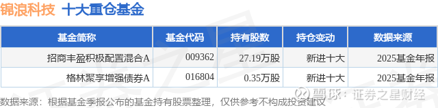 根据2025基金年报公募基金重仓股数据,重仓该股的公募基金共2家,其中持有数量最多的公募基金为招商基金的招商丰盈积极配置混合A。招商丰盈积极配置混合A目前规模为7.17亿元,最新净值0.7423(2月4日),较上一交易日上涨0.6%,近一年上涨30.25%。该公募基金现任基金经理为郭锐 文仲阳。文仲阳在任的基金产品包括:招商体育文化休闲股票A,管理时间为2020年12月2日至今,期间收益率为78.57%;郭锐在任的基金产品包括:招商核心价值混合,管理时间为2015年2月10日至今,期间收益率为134.33%;招商大盘蓝筹混合,管理时间为2015年4月1日至今,期间收益率为95.6%;招商境远灵活配置混合,管理时间为2016年3月2日至今,期间收益率为163.65%;招商成长精选一年定开混合A,管理时间为2020年6月19日至今,期间收益率为18.21%。