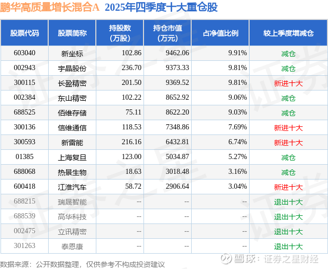 根据2025基金年报公募基金重仓股数据,重仓该股的公募基金共6家,其中持有数量最多的公募基金为鹏华基金的鹏华高质量增长混合A。鹏华高质量增长混合A目前规模为9.03亿元,最新净值1.4441(2月4日),较上一交易日下跌1.17%,近一年上涨99.74%。该公募基金现任基金经理为胡颖。胡颖在任的基金产品包括:鹏华稳健回报混合A,管理时间为2021年11月16日至今,期间收益率为83.91%;