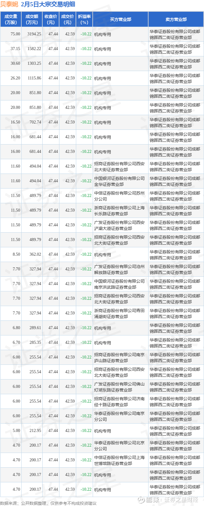 证券之星消息,2月5日贝泰妮发生大宗交易,交易数据如下: