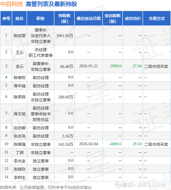 中自科技的高管列表及最新持股情况如下: