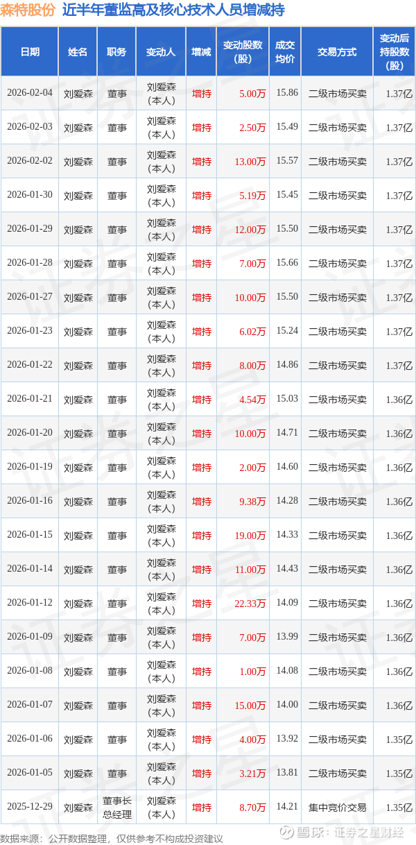 森特股份近半年内的董监高及核心技术人员增减持详情如下:
