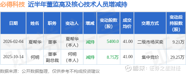 必得科技近半年内的董监高及核心技术人员增减持详情如下: