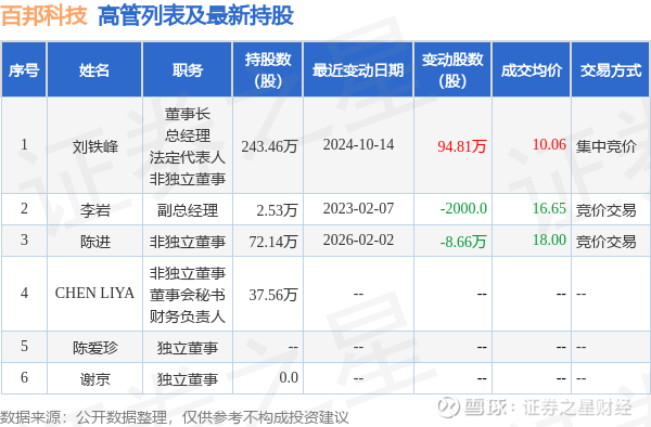 百邦科技的高管列表及最新持股情况如下: