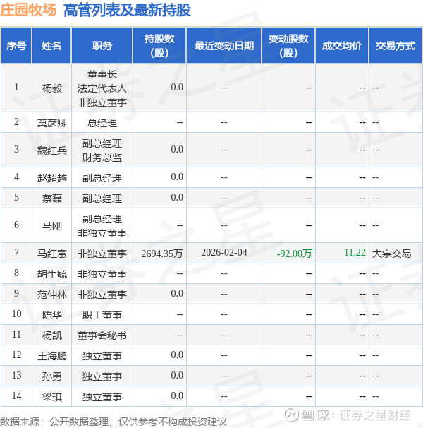 庄园牧场的高管列表及最新持股情况如下: