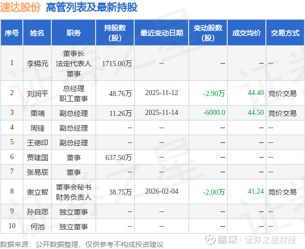 证券之星消息,根据2月5日市场公开信息、上市公司公告及交易所披露数据整理,速达股份(001277)最新董监高及相关人员股份变动情况:2026年2月4日公司董秘,高管谢立智共减持公司股份2.0万股,占公司总股本为0.0263%。变动期间公司股价上涨0.76%,2月4日当日收盘报41.23元。