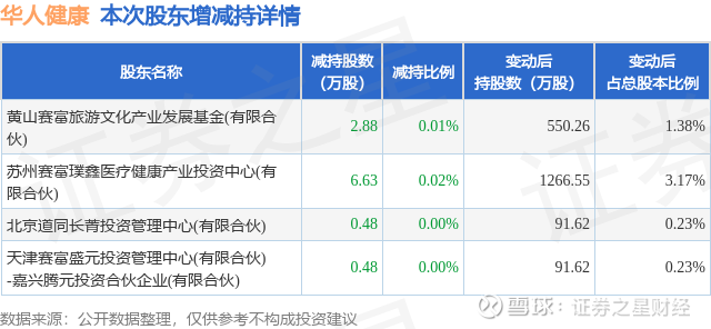 证券之星消息,2月5日华人健康发布公告《华人健康:简式权益变动报告书》,其股东黄山赛富旅游文化产业发展基金(有限合伙)、苏州赛富璞鑫医疗健康产业投资中心(有限合伙)、北京道同长菁投资管理中心(有限合伙)、天津赛富盛元投资管理中心(有限合伙)-嘉兴腾元投资合伙企业(有限合伙)于2026年2月5日合计减持10.47万股,占公司目前总股本的0.0262%,变动期间该股股价下跌4.05%,截止2月5日收盘报20.83元。