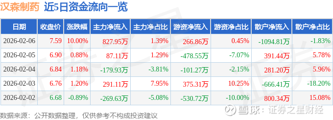 证券之星消息,汉森制药2月6日涨停收盘,收盘价7.59元。该股于9点34分涨停,11次打开涨停,截止收盘封单资金为1792.12万元,占其流通市值0.47%。