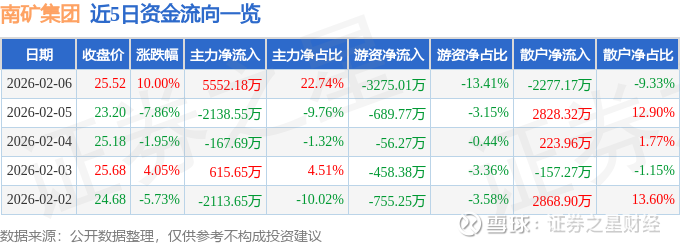 证券之星消息,南矿集团2月6日涨停收盘,收盘价25.52元。该股于9点38分涨停,未打开涨停,截止收盘封单资金为1518.7万元,占其流通市值0.73%。