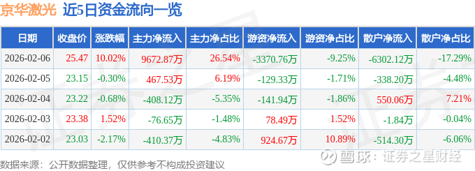 2月6日的资金流向数据方面,主力资金净流入9672.87万元,占总成交额26.54%,游资资金净流出3370.76万元,占总成交额9.25%,散户资金净流出6302.12万元,占总成交额17.29%。