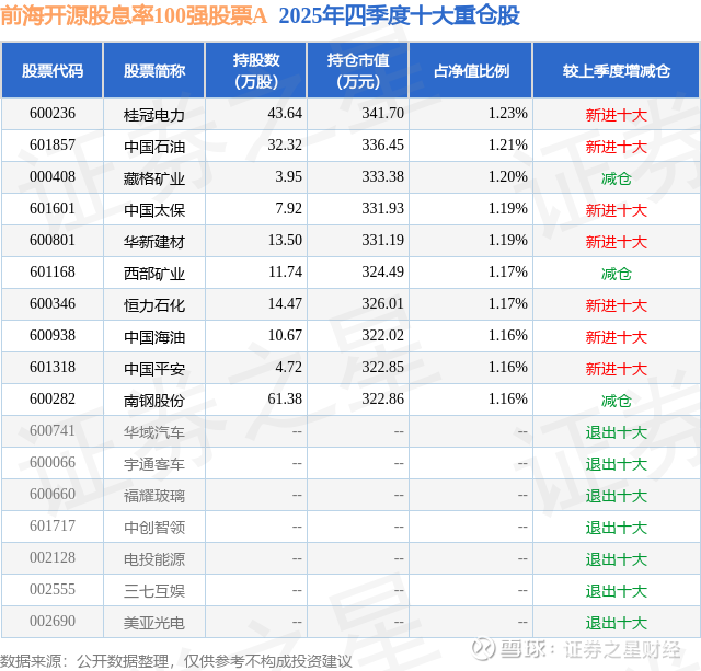 前海开源股息率100强股票A的前十大重仓股如下:
