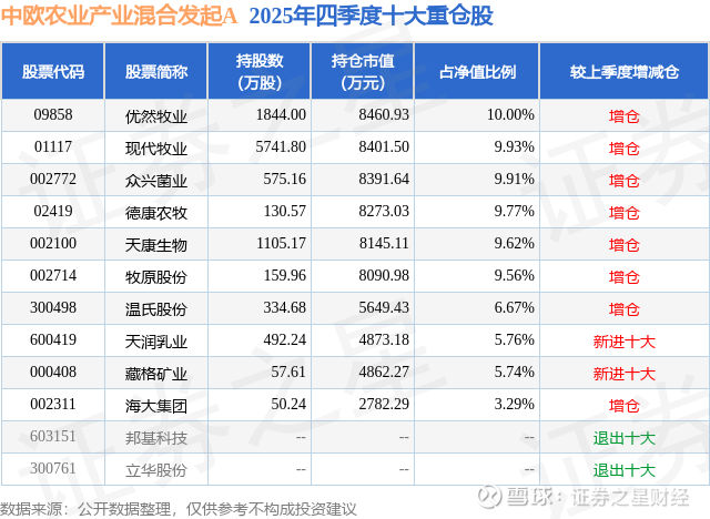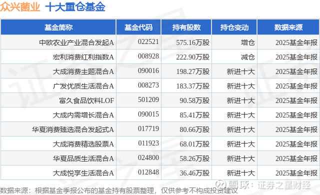 重仓众兴菌业的前十大公募基金请见下表: