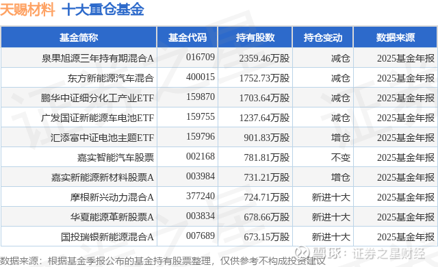 重仓天赐材料的前十大公募基金请见下表: