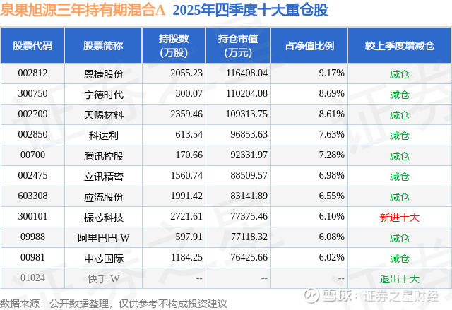 泉果旭源三年持有期混合A的前十大重仓股如下:
