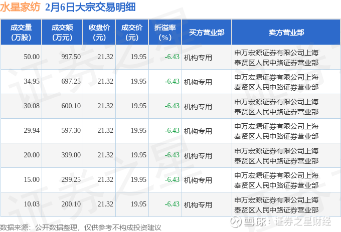 证券之星消息,2月6日水星家纺发生大宗交易,交易数据如下: