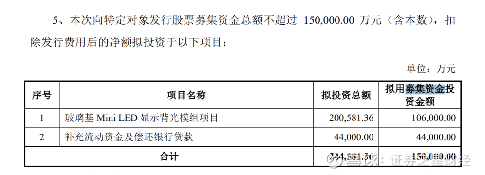 定增方案显示,公司拟向特定对象发行股票募集资金总额不超过15亿元,其中10.6亿元用于玻璃基MiniLED显示背光模组项目(下称项目一)、剩余4.4亿元用于补流。
