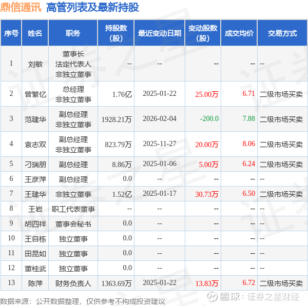 鼎信通讯的高管列表及最新持股情况如下: