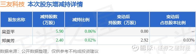 证券之星消息,2月6日三友科技发布公告《三友科技:股东减持股份结果公告》,其股东吴亚平、郑美芳于2026年1月24日至2026年2月6日间合计减持8.3万股,占公司目前总股本的0.0821%,变动期间该股股价下跌12.18%,截止2月6日收盘报16.08元。