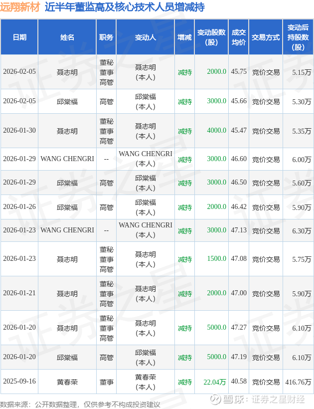 远翔新材近半年内的董监高及核心技术人员增减持详情如下: