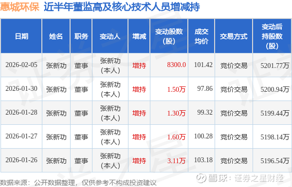 证券之星消息,根据2月6日市场公开信息、上市公司公告及交易所披露数据整理,惠城环保(300779)最新董监高及相关人员股份变动情况:2026年2月5日公司董事张新功共增持公司股份8300.0股,占公司总股本为0.0041%。变动期间公司股价下跌0.89%,2月5日当日收盘报101.57元。