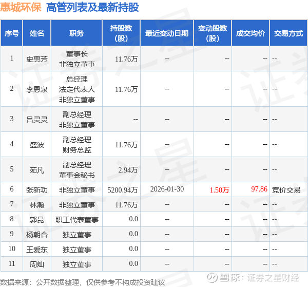 惠城环保近半年内的董监高及核心技术人员增减持详情如下: