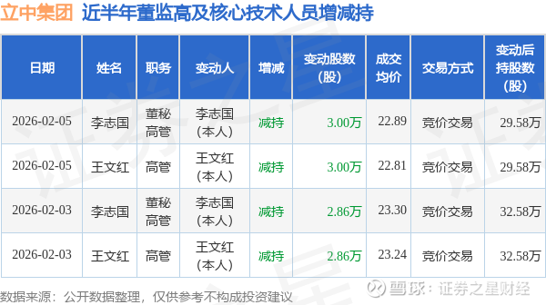 立中集团近半年内的董监高及核心技术人员增减持详情如下: