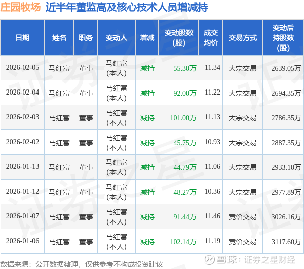 庄园牧场近半年内的董监高及核心技术人员增减持详情如下: