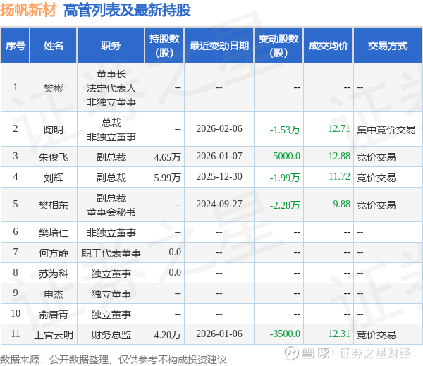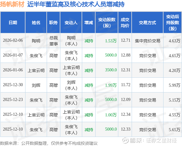 扬帆新材近半年内的董监高及核心技术人员增减持详情如下: