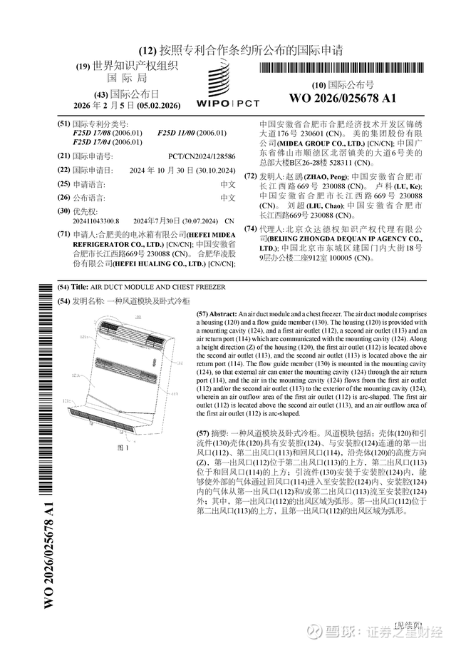 证券之星消息,根据企查查数据显示美的集团(000333)公布了一项国际专利申请,专利名为“一种风道模块及卧式冷柜”,专利申请号为PCT/CN2024/128586,国际公布日为2026年2月5日。