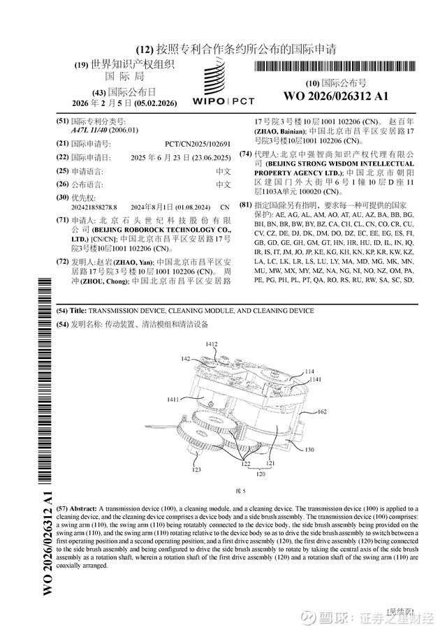 证券之星消息,根据企查查数据显示石头科技(688169)公布了一项国际专利申请,专利名为“传动装置、清洁模组和清洁设备”,专利申请号为PCT/CN2025/102691,国际公布日为2026年2月5日。
