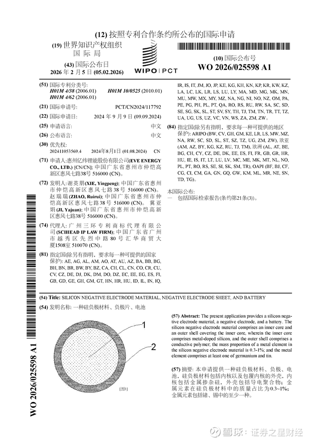 证券之星消息,根据企查查数据显示亿纬锂能(300014)公布了一项国际专利申请,专利名为“一种硅负极材料、负极片、电池”,专利申请号为PCT/CN2024/117792,国际公布日为2026年2月5日。
