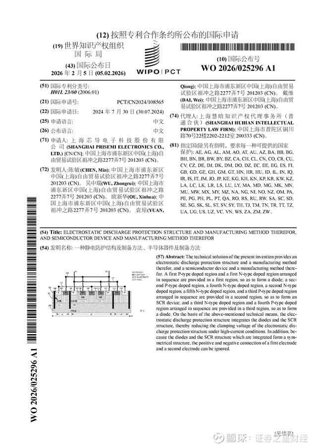 证券之星消息,根据企查查数据显示芯导科技(688230)公布了一项国际专利申请,专利名为“一种静电防护结构及制备方法、半导体器件及制备方法”,专利申请号为PCT/CN2024/108565,国际公布日为2026年2月5日。