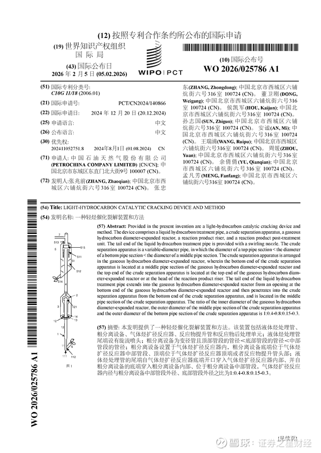 证券之星消息,根据企查查数据显示中国石油(601857)公布了一项国际专利申请,专利名为“一种轻烃催化裂解装置和方法”,专利申请号为PCT/CN2024/140866,国际公布日为2026年2月5日。