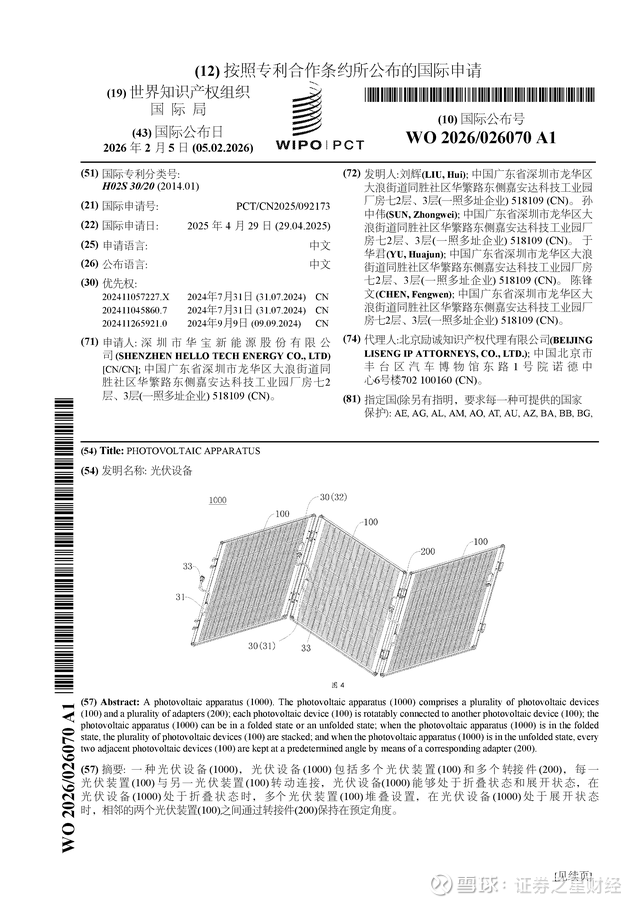 证券之星消息,根据企查查数据显示华宝新能(301327)公布了一项国际专利申请,专利名为“光伏设备”,专利申请号为PCT/CN2025/092173,国际公布日为2026年2月5日。