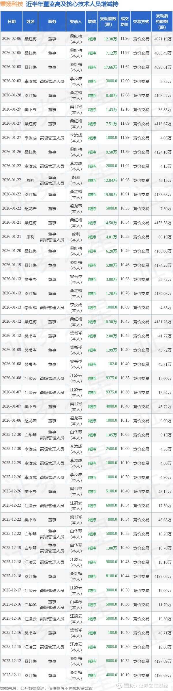 秉扬科技近半年内的董监高及核心技术人员增减持详情如下: