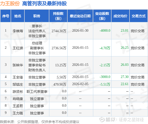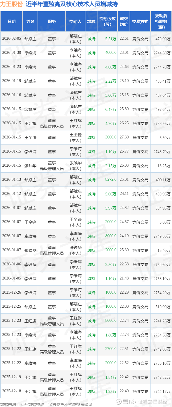 力王股份近半年内的董监高及核心技术人员增减持详情如下:
