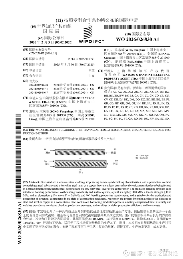 证券之星消息,根据企查查数据显示宝钢股份(600019)公布了一项国际专利申请,专利名为“一种具有抗延迟开裂特性的耐磨蚀覆层板带及生产方法”,专利申请号为PCT/CN2025/111393,国际公布日为2026年2月5日。