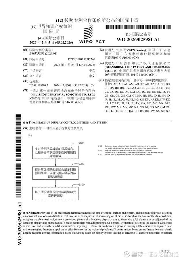 证券之星消息,根据企查查数据显示德赛西威(002920)公布了一项国际专利申请,专利名为“一种抬头显示控制方法及系统”,专利申请号为PCT/CN2025/085740,国际公布日为2026年2月5日。