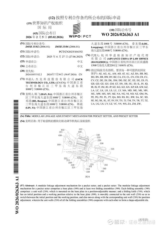 证券之星消息,根据企查查数据显示杰克科技(603337)公布了一项国际专利申请,专利名为“用于贴袋机的模块化联动调节机构以及贴袋机”,专利申请号为PCT/CN2025/104352,国际公布日为2026年2月5日。