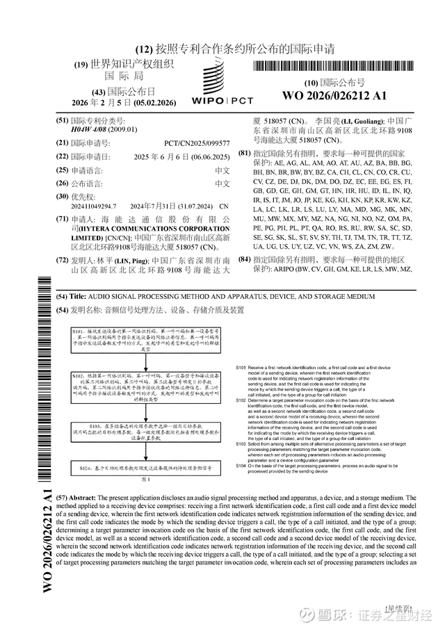 证券之星消息,根据企查查数据显示海能达(002583)公布了一项国际专利申请,专利名为“音频信号处理方法、设备、存储介质及装置”,专利申请号为PCT/CN2025/099577,国际公布日为2026年2月5日。