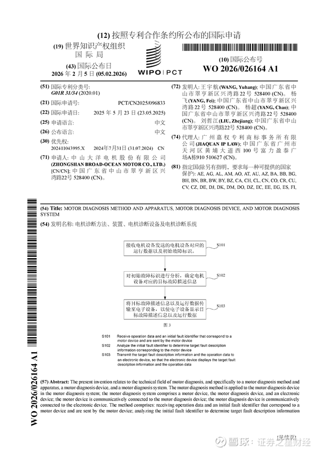 证券之星消息,根据企查查数据显示大洋电机(002249)公布了一项国际专利申请,专利名为“电机诊断方法、装置、电机诊断设备及电机诊断系统”,专利申请号为PCT/CN2025/096833,国际公布日为2026年2月5日。