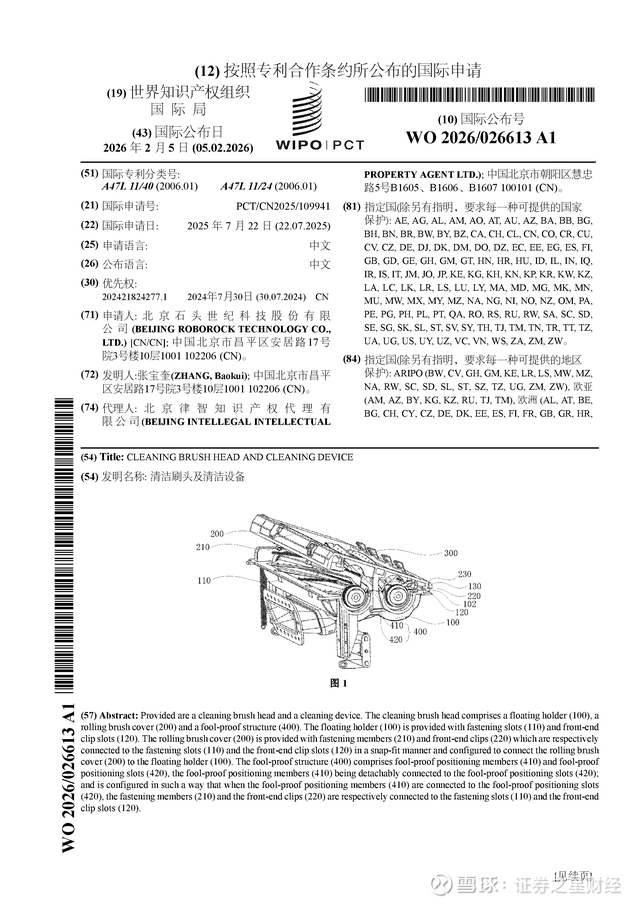 证券之星消息,根据企查查数据显示石头科技(688169)公布了一项国际专利申请,专利名为“清洁刷头及清洁设备”,专利申请号为PCT/CN2025/109941,国际公布日为2026年2月5日。