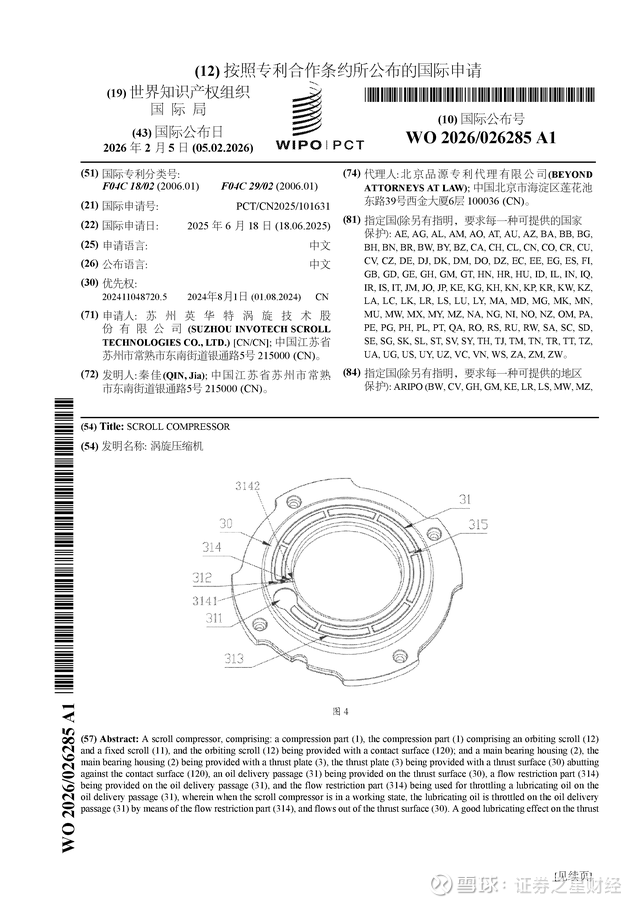 证券之星消息,根据企查查数据显示英华特(301272)公布了一项国际专利申请,专利名为“涡旋压缩机”,专利申请号为PCT/CN2025/101631,国际公布日为2026年2月5日。