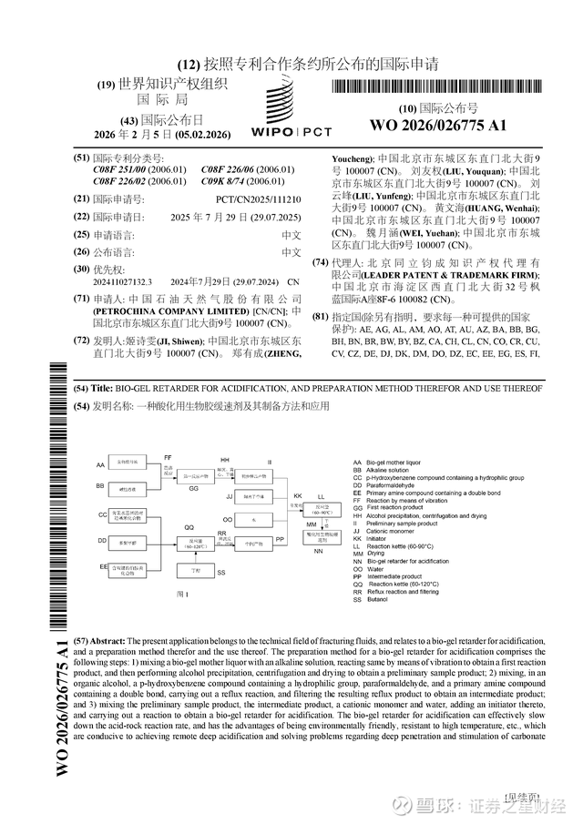 证券之星消息,根据企查查数据显示中国石油(601857)公布了一项国际专利申请,专利名为“一种酸化用生物胶缓速剂及其制备方法和应用”,专利申请号为PCT/CN2025/111210,国际公布日为2026年2月5日。