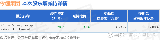 证券之星消息,2月8日今创集团发布公告《今创集团:关于持股5%以上股东权益变动触及1%刻度暨减持股份结果公告》,其股东China Railway Transportation Co. Limited于2025年12月10日至2026年2月6日间合计减持286.91万股,占公司目前总股本的0.3661%,变动期间该股股价上涨23.05%,截止2月6日收盘报14.68元。