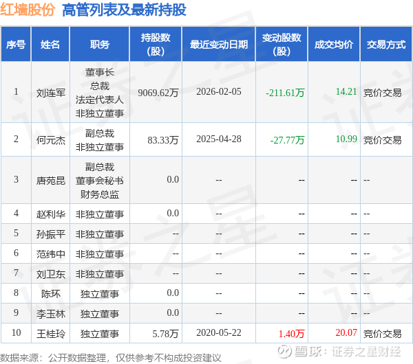 红墙股份的高管列表及最新持股情况如下:
