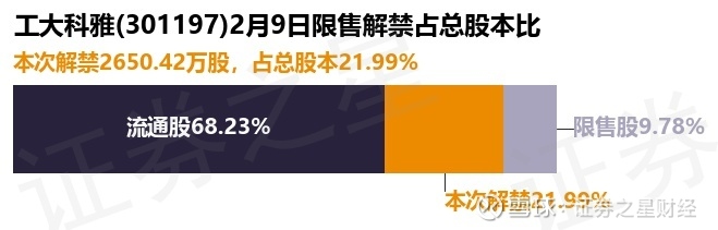 证券之星消息,根据市场公开信息整理,工大科雅(301197)于2月9日将有2650.43万股限售股份解禁,为公司追加承诺限售股份上市流通,占公司总股本21.99%。(本次数据根据历史公告整理得出,实际情况以上市公司最新公告为准)本次解禁后,公司还有1179.08万股限售股份,占总股本9.78%。具体如下图所示: