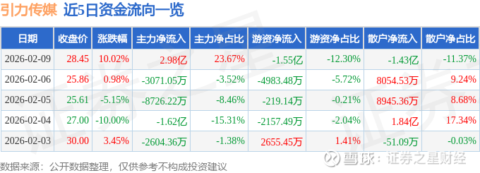证券之星消息,引力传媒2月9日涨停收盘,收盘价28.45元。该股于10点59分涨停,1次打开涨停,截止收盘封单资金为5266.66万元,占其流通市值0.69%。