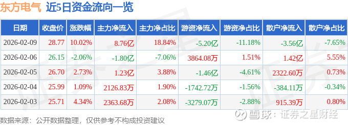 证券之星消息,东方电气2月9日涨停收盘,收盘价28.77元。该股于10点49分涨停,4次打开涨停,截止收盘封单资金为3027.47万元,占其流通市值0.05%。