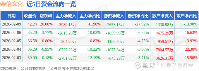 证券之星消息,荣信文化2月9日涨停收盘,收盘价42.24元。该股于9点25分涨停,未打开涨停,截止收盘封单资金为1.33亿元,占其流通市值5.83%。